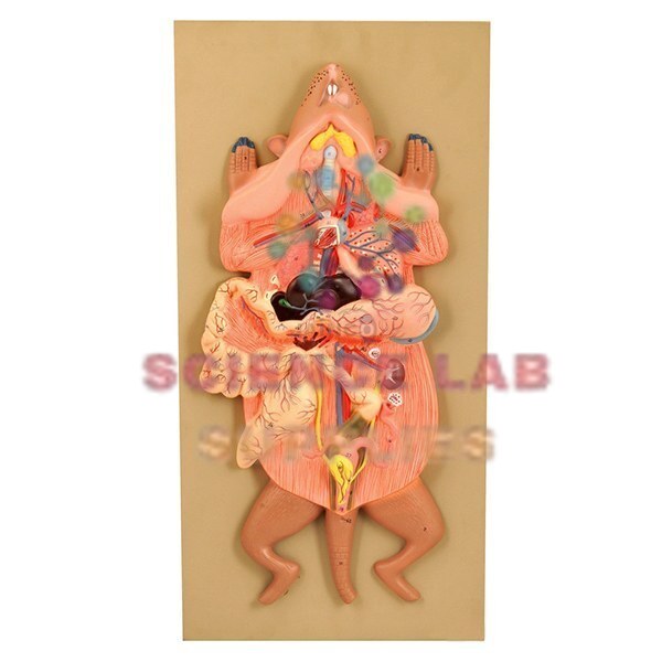 Showing all the general structure of a dissected frog. The model is mounted on a base with numbered Key Card.