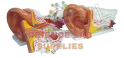 This version is 4-5 times larger than the original for easy demonstration. Petrous portion of the temporal bone section of the auditory canal is removable.The tympanic membrane with malleus and incus are also removable. Mounted on a sturdy base, appropiately coloured & nicely finished. Numbered with key card.